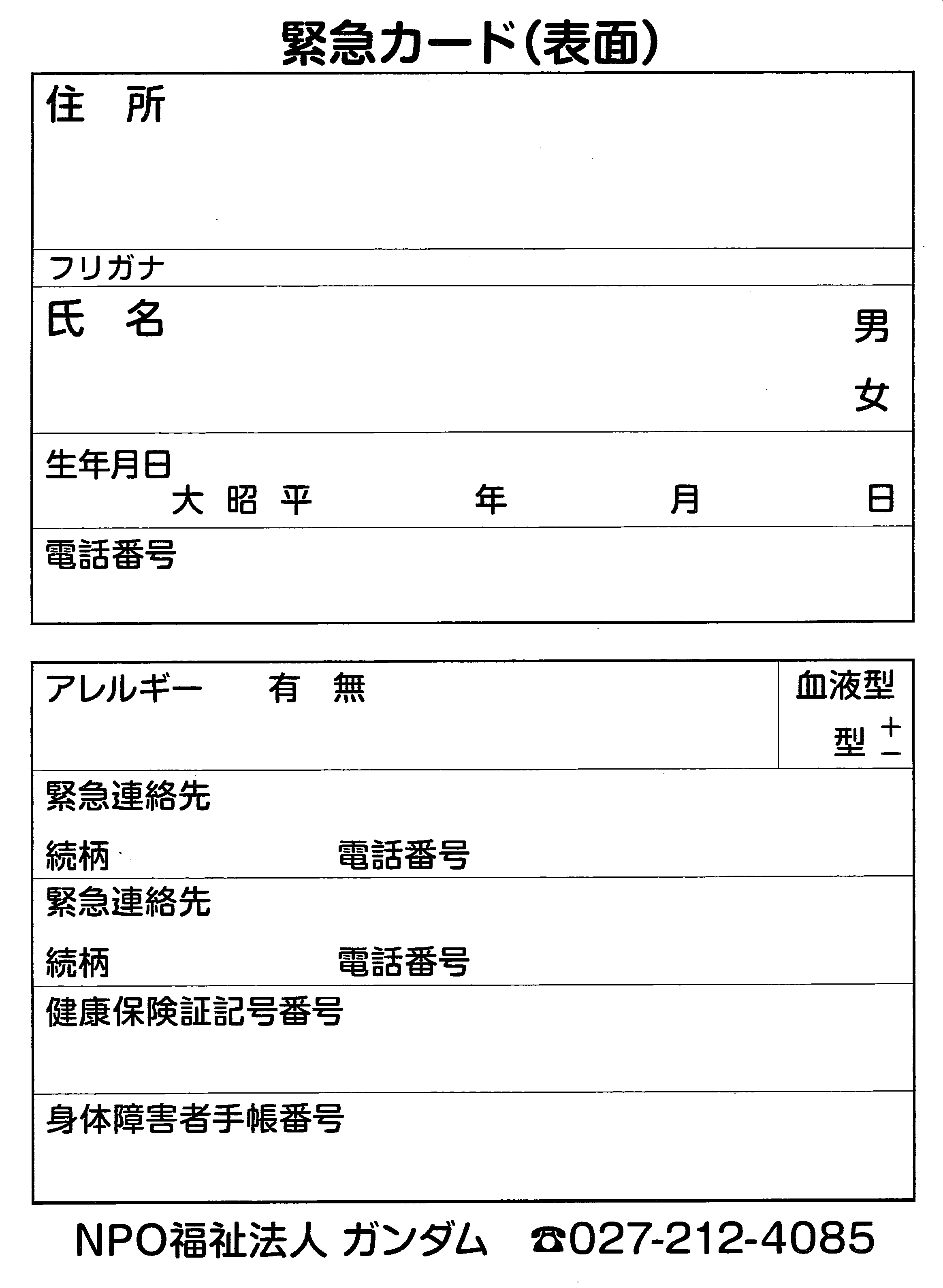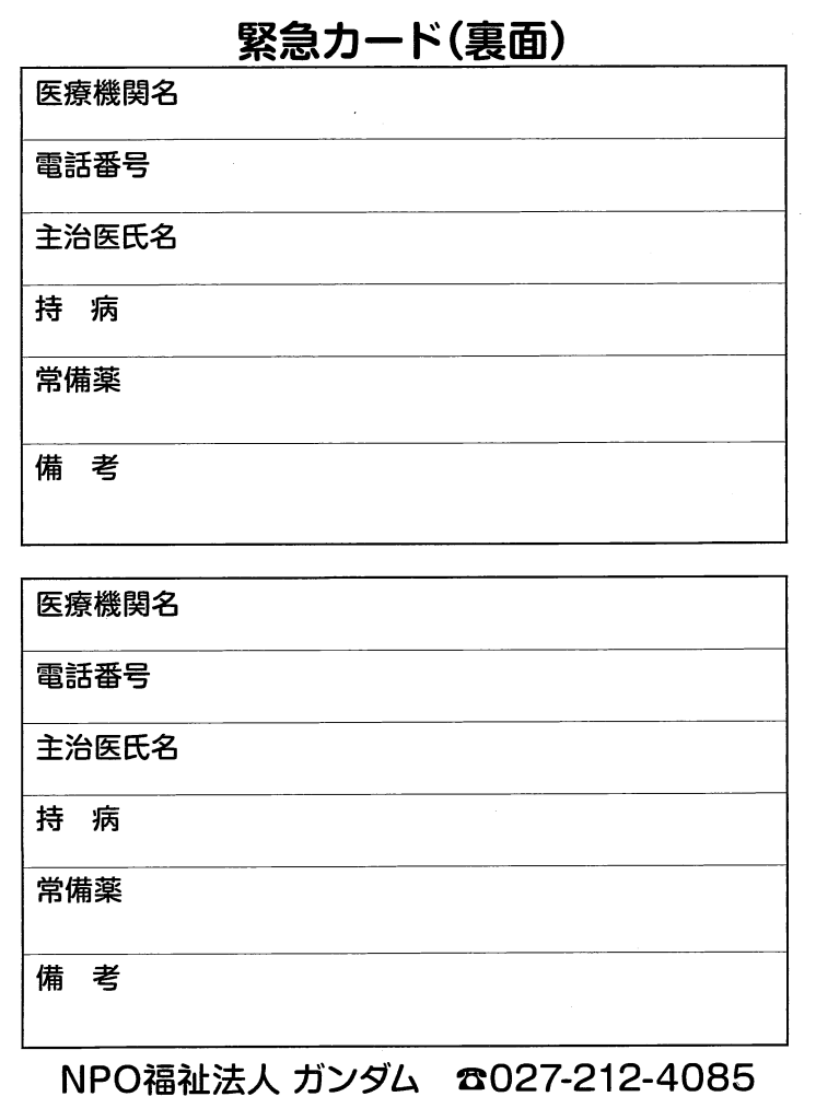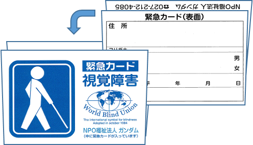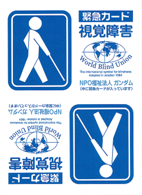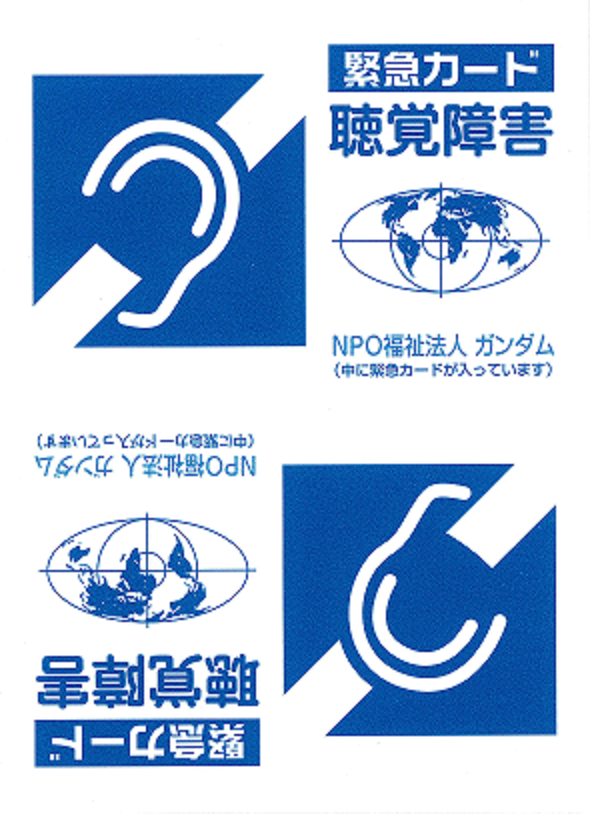 NPO福祉法人ガンダムでは、視覚障害者、聴覚障害者が災害時や、日常生活の中で健常者の方々の理解を得られ、容易に手を貸してもらえることが出来る様、障害者であることを明示出来る、携帯できるカードを配布しています。